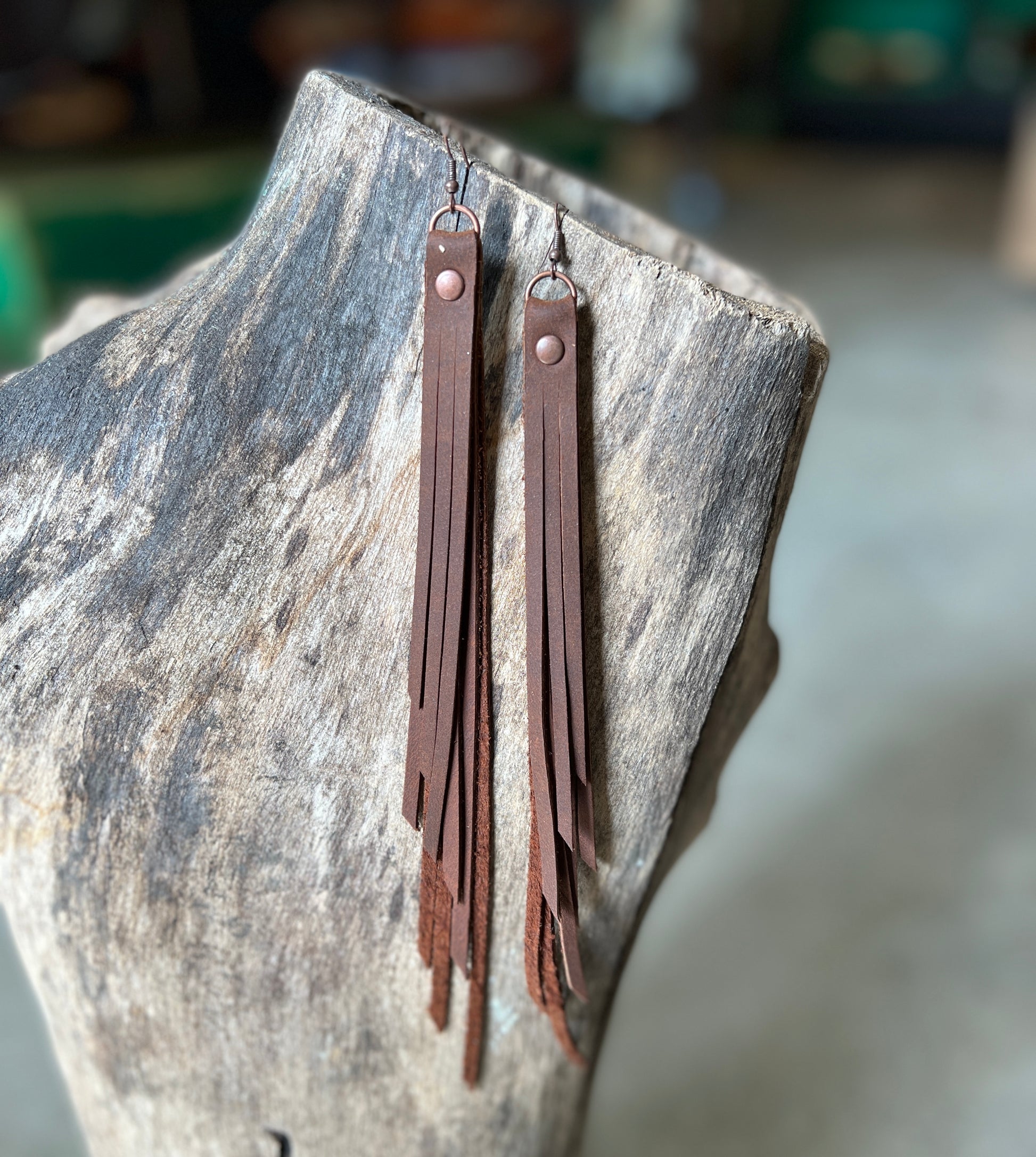Three-tiered genuine leather fringe earring. Measures approximately 8 inches.