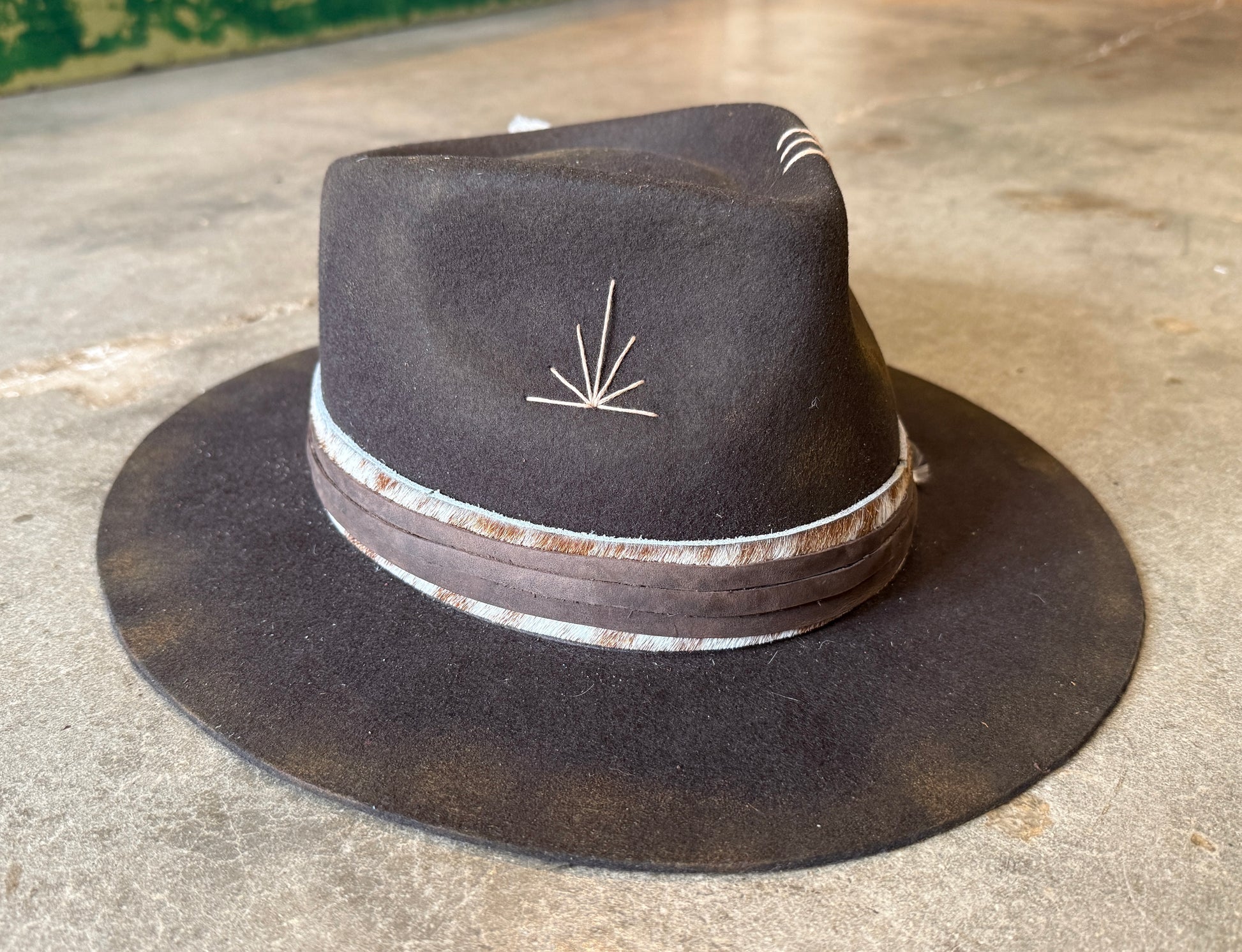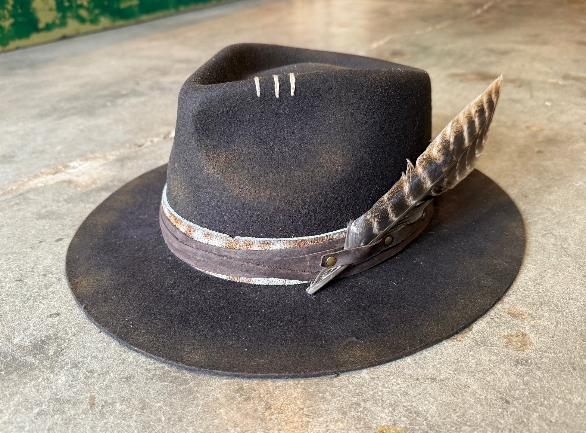 Wool felt western hat. One of a kind. Adorned with genuine leather and pheasant/turkey feathers. Size: medium