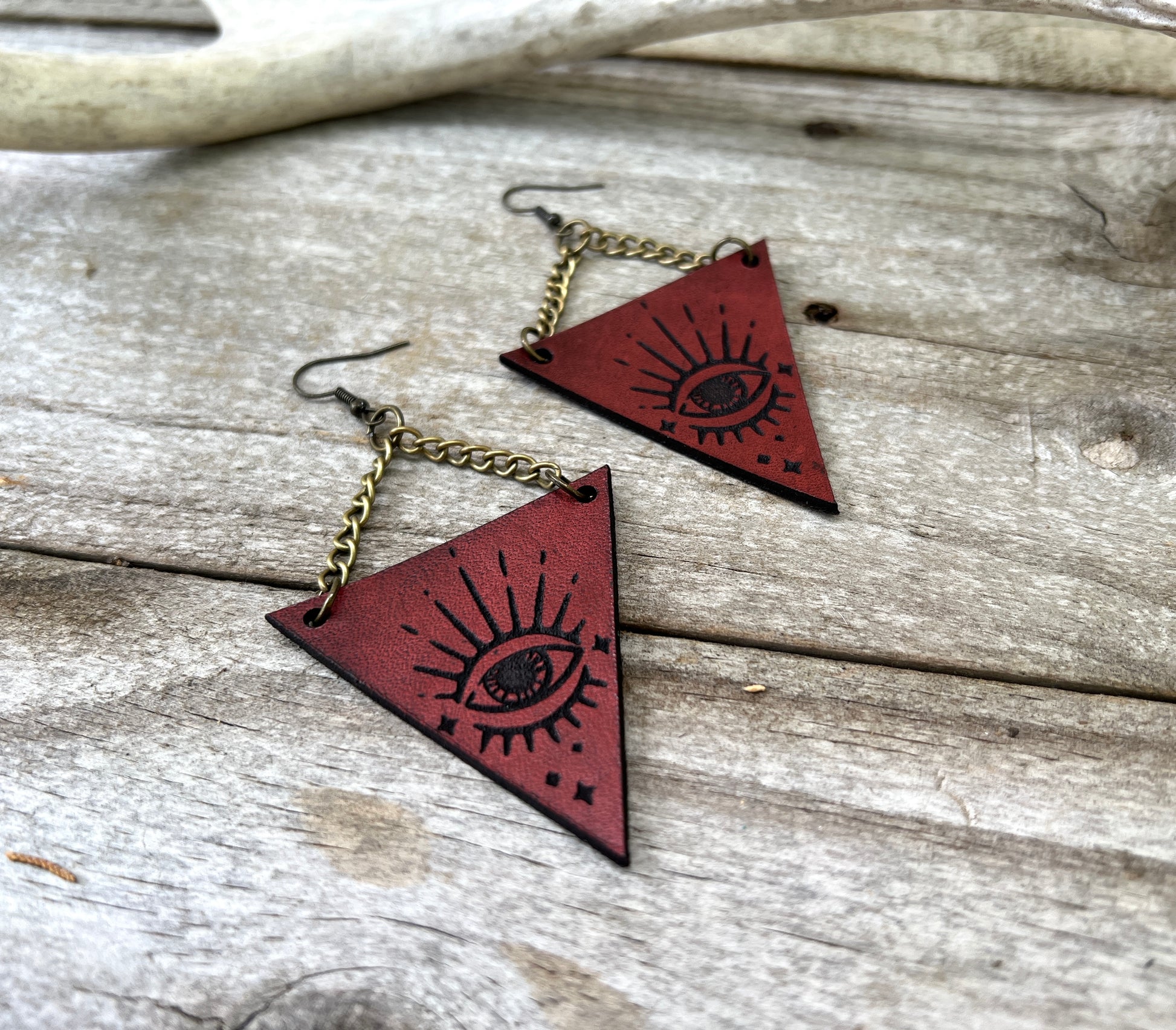 Super lightweight third eye leather earring constructed from hand-dyed genuine cowhide. Lightweight. 3" drop