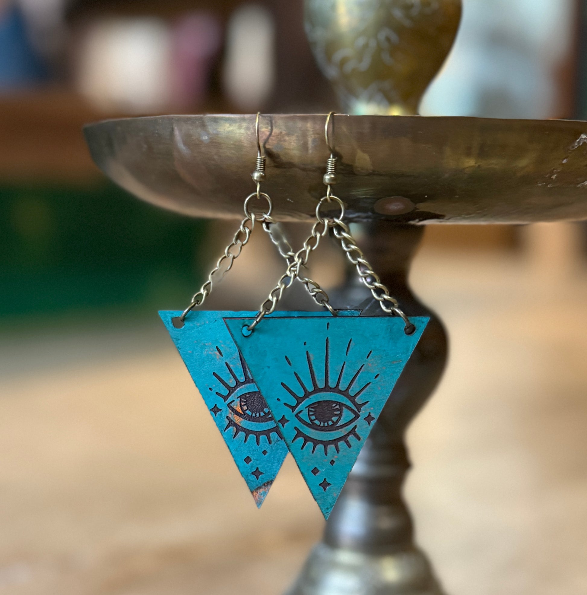 Super lightweight third eye leather earring constructed from hand-dyed genuine cowhide. Lightweight. 2” wide, 3.5" drop