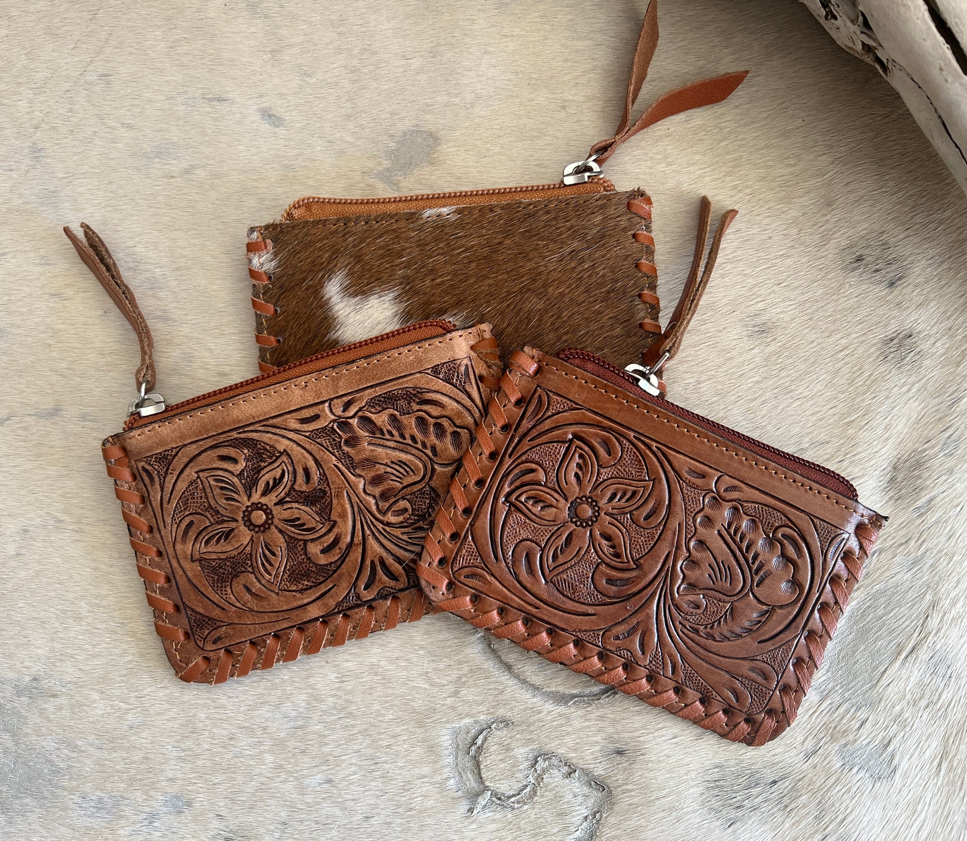 Zippered pouch. Tooled leather on one-side, hair-on cowhide on the other. Each piece is unique and may vary from items in photo.